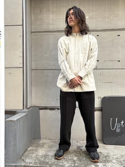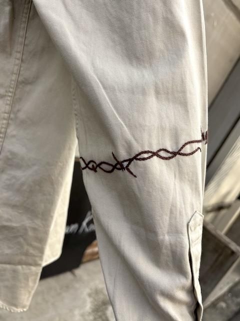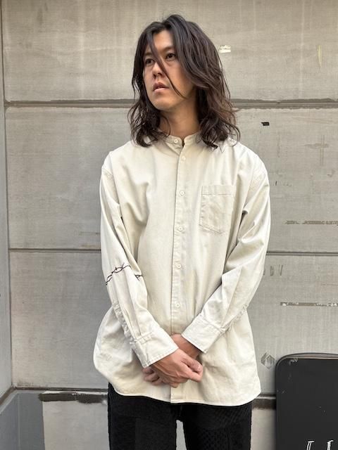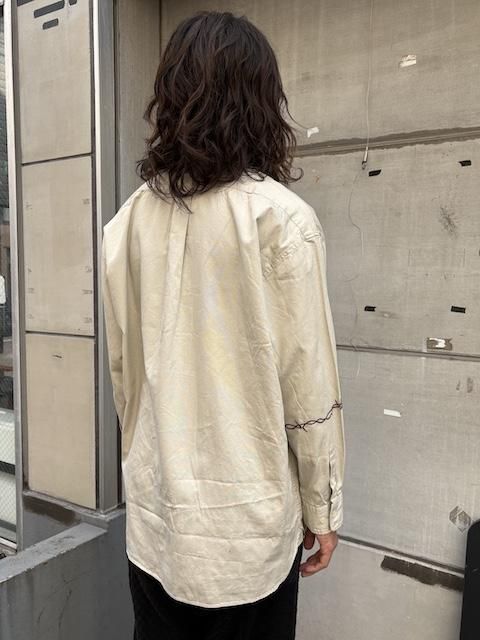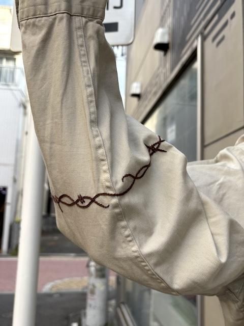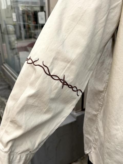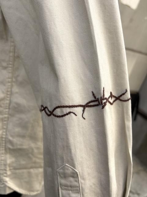 [再生産中] rokuromi × Ryumei 手刺繍 6oz Oxford "有刺鉄線" AラインSH -Lt Greige- [アイヌ技法,和,トライバル,手刺繍,]