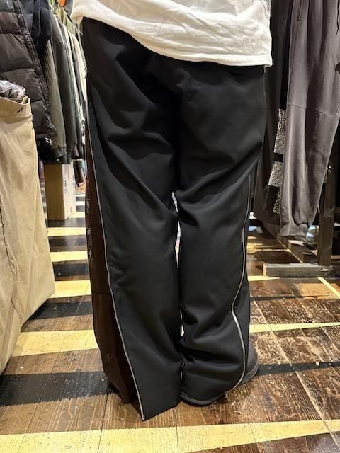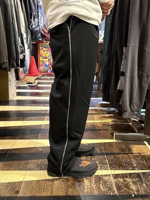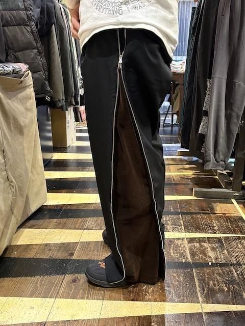 重ね着のようなデザインで、両サイドには上から下まで逆開ファスナーが付き、開けると太さが出る為シルエットの変化を楽しめる。